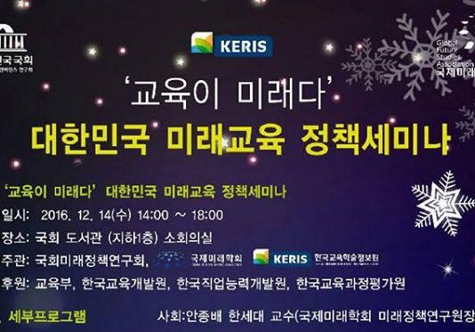 현재 혼란스러운 대한민국과 제4차 산업혁명의 거센 파도를 성공적으로 넘을 수 있는 미래교육 방안과 정책을 모색하는 자리인 '교육이 미래다' <대한민국 미래교육 정책세미나>가 열린다.국제미래학회와 국회미래정책연구회는 내년에 출간될 <대한민국 미래교육보고서> 연구와 집필의 일환으로 12월 14일(수) 14시부터 국회도서관(지하1층) 소회의실에서 '교육이 미래다' <대한민국 미래교육 정책세미나>를 개최한다고 밝혔다.이날 <대한민국 미래교육 정책세미나>에는 이남식 국제미래학회장과 정갑윤 국회미래정책연구회장의...