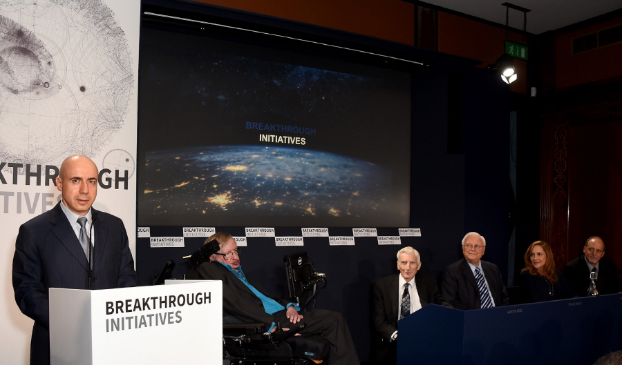 – 10년의 거대한 프로젝트(Breakthrough_Initiatives)인 외계인을 찾아라(Massive Search forE.T. as SETI) 왼쪽부터 인터넷 투자자 유리 밀너, 물리학자 스티븐 호킹, 천체 물리학자 마틴리스, SETI 연구 선구자 프랭크 드레이크, 코스모스 스튜디오 앤 Druyan의 공동 설립자이자 CEO, UC 버클리 천문학 교수 제프 마시. 영국의 천재 물리학자인 스티븐 호킹박사(Stephen Hawking)와 러시아 재벌 유리 밀러너(Yuri Milner)가
