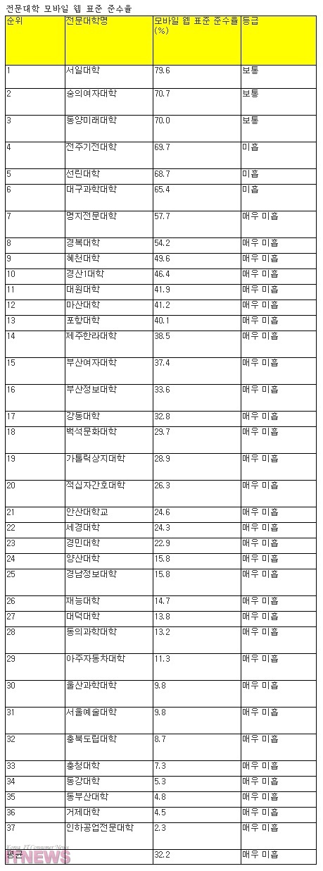 전문대학은 25%(네 곳 중 한 곳)만이 모바일 웹 서비스를 제공하고 있으며, 서비스를 제공하는 곳들도 대부분 표준을 준수하지 않는 것으로 나타났으며, 기존의 웹 이외에 모바일 웹(모바일 기기용으로 별도 제작한 웹) 이용이 크게 늘고 있는데, 대학들이 제대로 대응하지 못하는 것으로 드러났다.