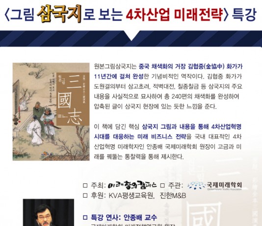 최고의 전략서인 삼국지를 통해본 4차산업혁명 미래전략 특강이 국내 최초로 개최된다. 급변하는 4차산업혁명시대에 대응하기 위한 미래 전략을 삼국지의 핵심 내용을 통해 살펴보고 제안하는 <그림 삼국지로 보는 4차산업 미래전략> 특강이 미래창의캠퍼스와 국제미래학회 주최와 KVA평생교육원, 진한M&B의 후원으로 2017년 11월 14일(화) 오후 7시 – 9시 KVA아카데미 (역삼동 은주빌딩 4층)에서 개최된다. 중국 채색화의 거장 김협중(金協中) 화가가...