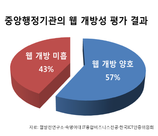 정부가 ‘정부3.0’을 주장하면서 공공정보의 개방·공유·소통·활용을 강조하고 있는 가운데, 정작 중요한 공공정보가 많은 중앙부처 대다수가 웹사이트의 정보 검색을 부분 차단하여 정부 정책에 역행하고 있는 것이 드러났다. 웹발전연구소(www.smartebiz.kr)와 숙명여대 정책산업대학원 IT융합비즈니스전공 및 한국ICT인증위원회가 공동으로 중앙행정기관 웹사이트 40개를 대상으로 실시한 검색엔진 배제선언 평가결과 40개 중앙부처 중 17개 기관 웹사이트가 검색엔진의 정보검색을 부분 차단하고...