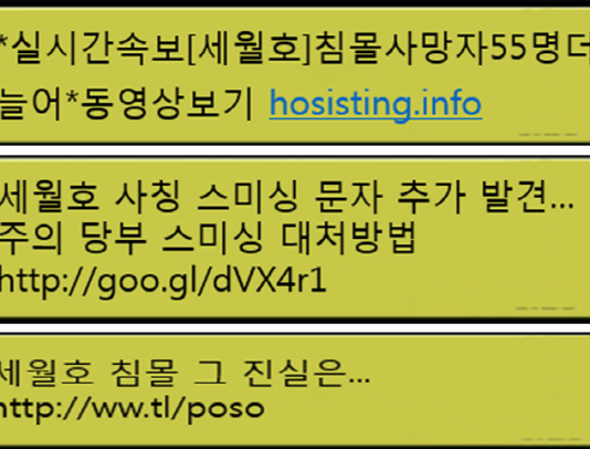 세월호 침몰사고를 사칭한 스미싱 문자가 추가로 발송되고 있는 것이 확인되어 각별한 주의가 요구된다.미래창조과학부와 한국인터넷진흥원(KISA)은 현재까지 총 4건, 확인된 스미싱 문자는 발견되는 즉시 차단하고 검경 등 수사기관에 실시간 통보하고 있다고 밝혔다. 추가로 확인된 스미싱 문자에는 ‘세월호 침몰 그 진실...http://ww.tl/news’라는 문구가 적혀있으며, 해당 메시지에는 인터넷주소를 포함하고 있다.세월호 침몰사고 사칭 스미싱...