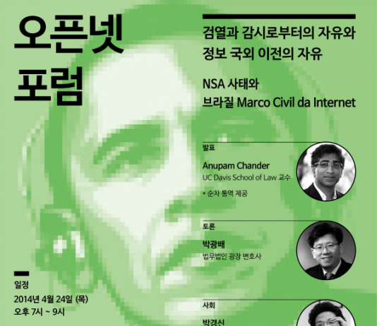인터넷 사용자 권리를 옹호하는 시민단체 오픈넷은 2014년 4월 24일(목) 오후 7시 강남구 테헤란로 스타트업 얼라이언스에서 아누팜 챈더(Anupam Chander) 교수를 초청하여 "검열과 감시로부터의 자유와 정보 국외 이전의 자유"를 주제로 오픈넷 포럼을 개최한다.아누팜 챈더 교수는 글로벌화와 디지털화 분야에 정통한 학자로 현재는 캘리포니아주립대(데이비스) 로스쿨 교수를 역임하고 있다.NSA 사태 이후 '감시와 검열로부터의...