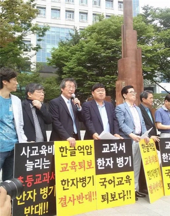 한글단체들이 초등학교 교과서 한자병기 추진에 대해 적극 반대에 나섰다.25일 오전 10시 30분, 서울 세종문화회관 옆 조선어학회한말글수호기념탑 앞에서 교육을바꾸는새힘, 국어문화운동실천협의회, 한글문화연대, 한글학회, 전국교직원노동조합,참교육학부모회 들 43개 한글문화단체와 교육단체들은 “초등학교 교과서 한자병기 추진 반대 기자회견”을 했다. 이날 참석자들은 “광복 70주년이 되는 해에 일본식 한자혼용 세력의 말만 듣고 초등학교 교과서에 한자를 병기하면 우리말과...