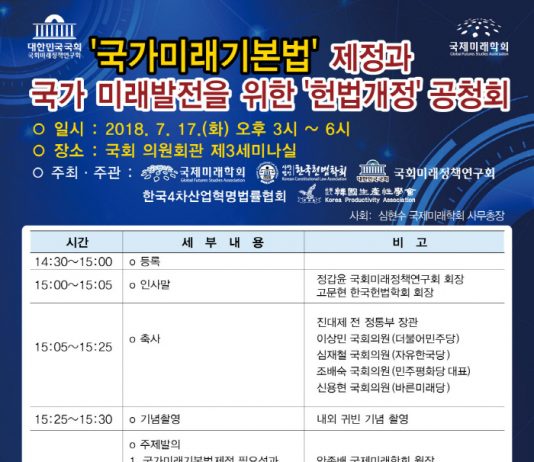 국내 처음으로 대한민국 국가 미래발전을 지향하는 정책이 입안되도록 유도하고, 미래 변화에 대응해 예산 낭비를 예방하기 위한 ‘국가미래기본법’ 제정을 논의하는 공청회 자리가 마련된다.7월 17일(화) 오후 3시 국회 의원회관 제3세미나실에서 열리는 ‘국가미래 기본법’제정 및 국가 미래 발전을 위한 ‘헌법 개정’ 공청회는 급변하는 미래 환경에서 지속가능한 국가 및 지자체 발전에 이바지하고, 예산을...