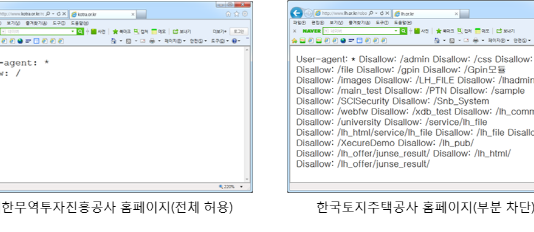 한국방송공사(KBS), 대한석탄공사, 한국지역난방공사, 한국조폐공사, 한국가스공사, 대한송유관공사 등 공공기관들이 웹사이트 정보에 접근하는 검색엔진을 전체 차단 하는 것으로 드러났다. aT한국농수산식품유통공사, 인천국제공항공사, 한국석유공사, 국민체육진흥공단, 국립공원관리공단, 한국장애인고용공단, 선박안전기술공단, 대한법률구조공단, 국민연금공단, 근로복지공단, 교통안전공단, 한국토지주택공사, 대한주택보증, 한국법무보호복지공단, 국민건강보험공단, 한국철도시설공단, 한국관광공사, 한국광물자원공사, 서울신문사, 공무원연금공단, 한국시설안전공단 등 공공기관 웹사이트는 검색엔진의 접근을 일부 허용하거나 차단함으로써 부분차단하고 있는 것으로 확인됐다. 청와대...