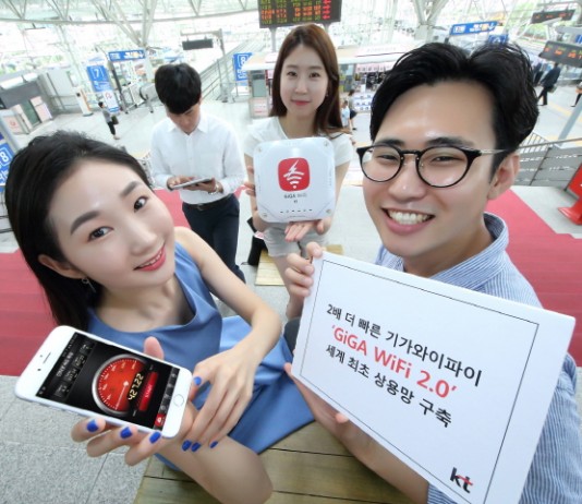 KT는 영화관, 백화점, 아파트단지 등 주요공공장소에서 서비스 중인 기존 GiGA WiFi보다 2배 빠른 1.73Gbps의 속도를 제공하는 ‘GiGA WiFi 2.0’을 22일부터 선보인다고 밝혔다. 기존 GiGA WiFi는 국제표준 기술 IEEE 802.11.ac Wave1 규격으로 최대 1.3Gbps의 속도를 구현하고 모바일에서는 최대 867Mbps 속도를 지원하며, 동시접속자수 512명까지 수용한다. 더 강력해진 ‘GiGA WiFi 2.0’은 차세대 규격인 IEEE...