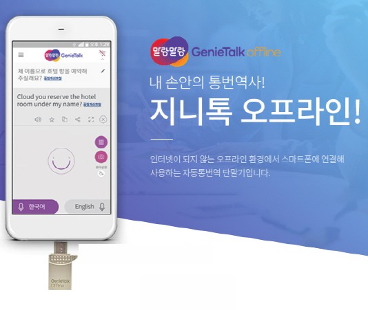 한글과컴퓨터가 18일, 인공지능 기반의 자동통번역 서비스인 ‘한컴 말랑말랑 지니톡’을 인터넷이 안 되는 환경에서도 사용할 수 있도록 오프라인 제품을 출시했다. 한컴은 인터넷이 원활하지 않은 해외 지역이나 비행기 안에서도 통번역 서비스를 사용할 수 있도록 소형 OTG USB 메모리형태의 ‘지니톡 오프라인’을 출시, 사용자는 ‘지니톡 오프라인’을 스마트폰에 꽂기만 하면 한국어, 영어, 중국어, 일본어 자동통번역...