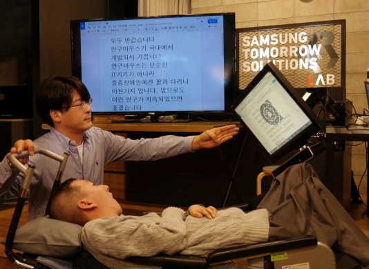 삼성전자가 손발의 움직임이 불편한 사람도 눈동자로 컴퓨터와 인터넷을 사용할 수 있게 해주는 안구마우스 ‘아이캔 플러스(EYECAN+)’를 새롭게 선보였다. 삼성전자는 25일 서울 서초사옥 투모로우 솔루션 랩(LAB)에서 안구마우스의 차세대 버전인 ‘EYECAN+’를 시연하는 행사를 열었다. 안구마우스는 컴퓨터의 마우스 조작을 손 대신 눈동자로 할 수 있게 해주는 장치다. 안구마우스를 이용하면 몸을 전혀...
