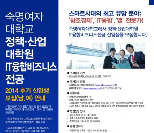 IT융합비즈니스전공, 유망 대학원으로 부상정부의 핵심 정책기조인 창조경제와 IT융합에 대한 업계와 학계의 관심이 고조되고 있는 가운데 숙명여대에서 창조경제와 IT융합 및 창업에 특화한 석사과정 전공을 신설하고, 전문인력 양성에 앞장서고 있어서 유망 대학원으로 각계의 관심을 모으고 있다.올해 신설된 숙명여대 정책․산업대학원 IT융합비즈니스전공 주임교수인 문형남교수는 “창조경제와 IT융합 및 창업은 매우 유망한 분야로서 인력...