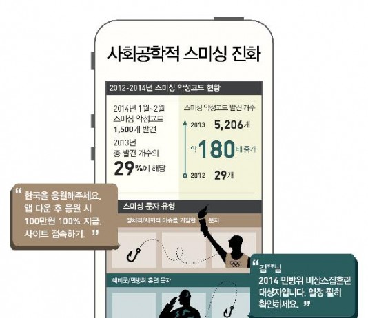 작년 한 해를 떠들썩하게 했던 스미싱이 수법을 바꿔가며 여전히 기승을 부리고 있다.안랩은 통계 결과, 올해 2월까지 스미싱 악성코드가 총 1,500개 발견됐다고 밝혔다. 이는 2012년 한 해 동안 발견된 스미싱 악성코드(29개)의 52배, 2013년 총 발견 개수(5,206개)의 29%에 해당하는 것으로, 스미싱 악성코드는 상당히 빠른 속도의 증가세를 보이고 있다.최근 발견된 스미싱...