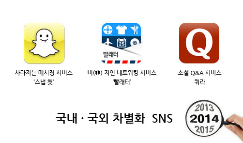 최근 국내 SNS 시장의 트렌드를 보면 외국계 기업이 제공하는 SNS의 성장세에 비해 차별성과 실적이 저조한 한국형 토종 sns들이 줄줄이 서비스를 종료하고 있다.외국에서도 비슷비슷한 기능을 가진 서비스 보다는 새로운 서비스가 주목받아 앞으로의 트렌드는 차별화에서 경쟁력을 모색해야 할 것으로 보이며 이에 관계자들의 고민이 깊어지고 있다.스냅챗스냅챗은 사진과 동영상을 주고받는 모바일 메신저 애플리케이션이다....